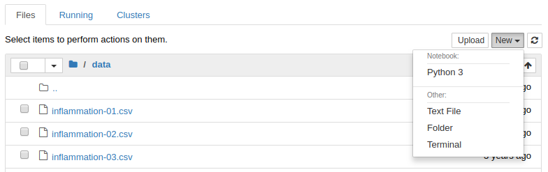 Then create a new notebook by clicking “New” button on the right and selecting “Python 3” from the drop-down menu: